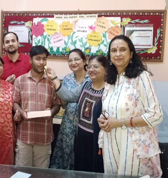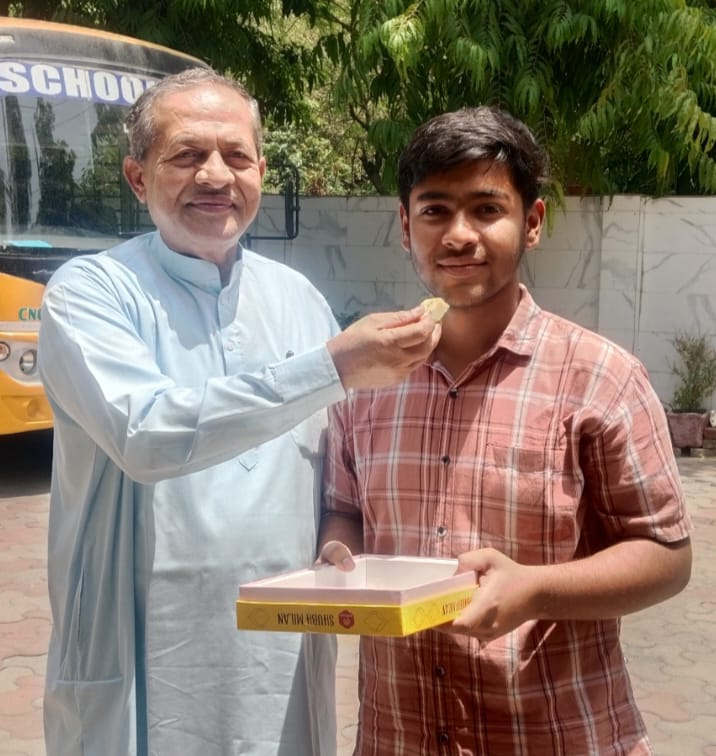 School topper Tanishk Rajput celebrated his outstanding CBSE 2024–25 result by distributing sweets to the faculty members, expressing his gratitude for their support and guidance. Sir Nawab Singh Nagarji blessed him for his future endeavours.